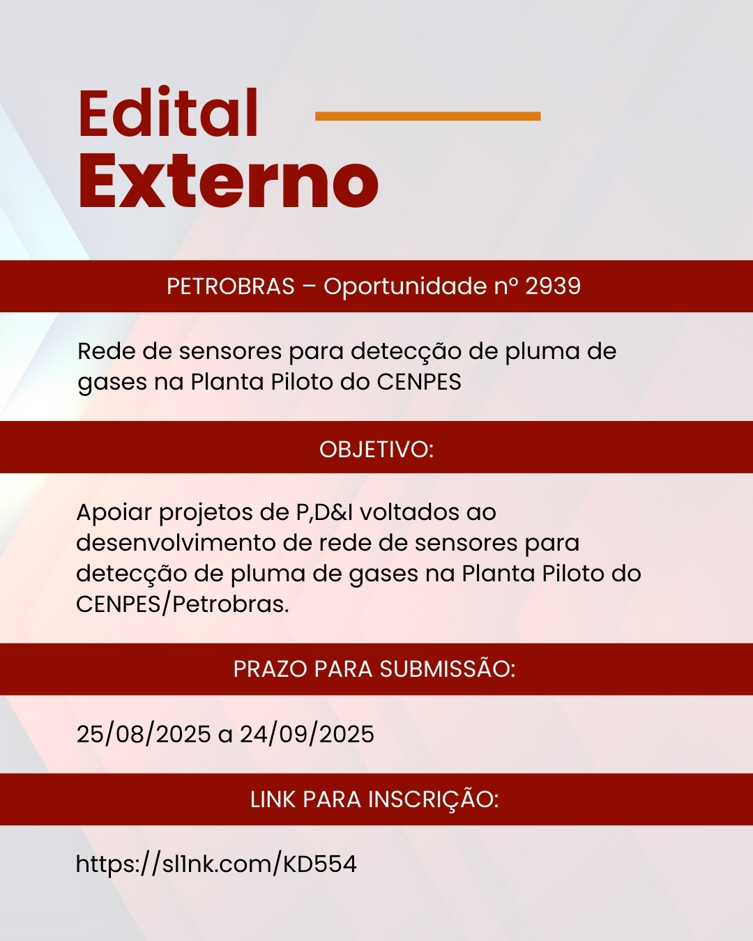 A Petrobras lançou uma chamada para submissão de propostas de Pesquisa, Desenvolvimento e Inovação (P&D&I) na área de sensores para detecção de pluma de gases, com foco na Planta Piloto do Centro de Pesquisas da Petrobras (CENPES).