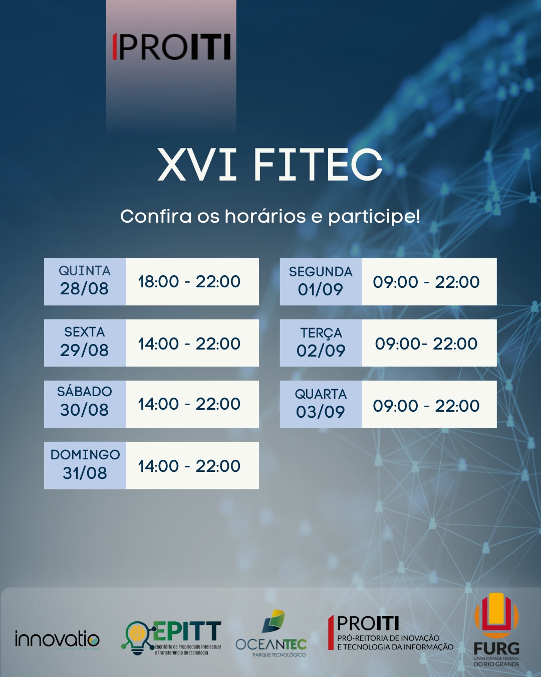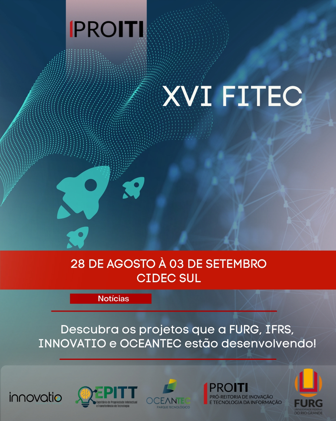 A 16ª Feira de Inovação Tecnológica da FURG (Fitec) está prestes a começar. De 28 de agosto a 3 de setembro de 2025, o Cidec-Sul, no Campus Carreiros da Universidade Federal do Rio Grande (FURG), será palco de uma programação voltada à ciência, tecnologia e inovação. Realizada em conjunto com a 50ª Feira do Livro da FURG, a Fitec trará mais de 30 projetos inovadores desenvolvidos por estudantes, pesquisadores e empresas vinculadas à universidade e instituições parceiras.