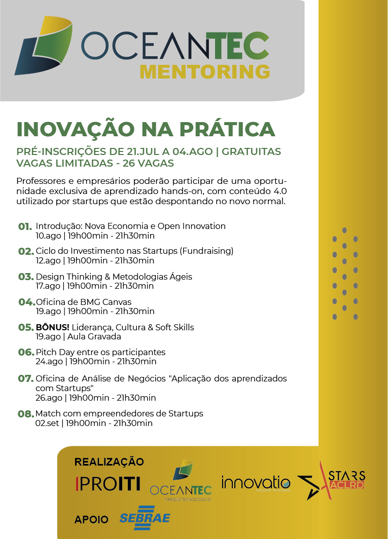 Estão abertas as pré-inscrições para o “Inovação na Prática”, primeira atividade do recém-lançado programa Oceantec Mentoring. A iniciativa consiste em uma ação gratuita com caráter hands on (foco na prática experiencial) com conteúdo 4.0 utilizado por Startups que vem se consolidando no novo mercado de trabalho gerado pelo contexto pandêmico.