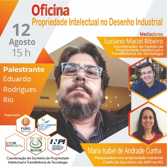 A Pró-reitoria de Inovação e Tecnologia da Informação, por meio do Escritório de Propriedade Intelectual e Transferência de Tecnologia (OCEANTEC/PROITI) da Universidade Federal do Rio Grande (FURG), tem a satisfação de convidar a comunidade para o Webinar sobre o tema Propriedade Industrial e o Desenho Industrial, que será ministrado por Eduardo Rodrigues Rio, Tecnologista em Propriedade Industrial, Bacharel em Desenho Industrial, com especialização em Ergonomia e Usabilidade, Mestre e Doutorando em Propriedade Intelectual e Inovação pela Academia de Propriedade Intelectual, Inovação e Desenvolvimento do INPI, atua como Servidor público do INPI desde 2006, já tendo atuado como chefe do Serviço de Exame Formal de Patentes entre 2010 e 2017 e, atualmente, exerce o cargo de examinador e chefe substituto da Divisão Técnica de Desenhos Industriais da Diretoria de Marcas do INPI.